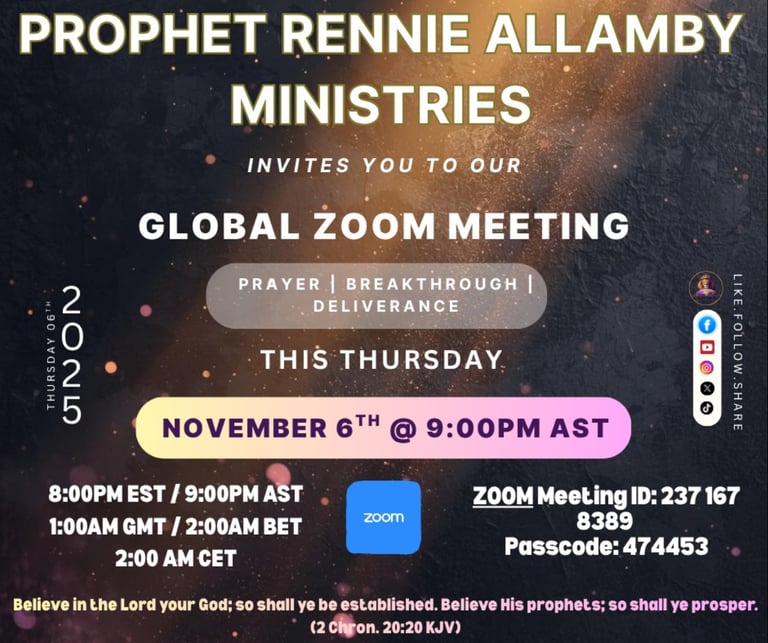 Our Zoom meetings typically commence every Thursday at 9pm American Standard Time (AST). Below are the times for popular cities...